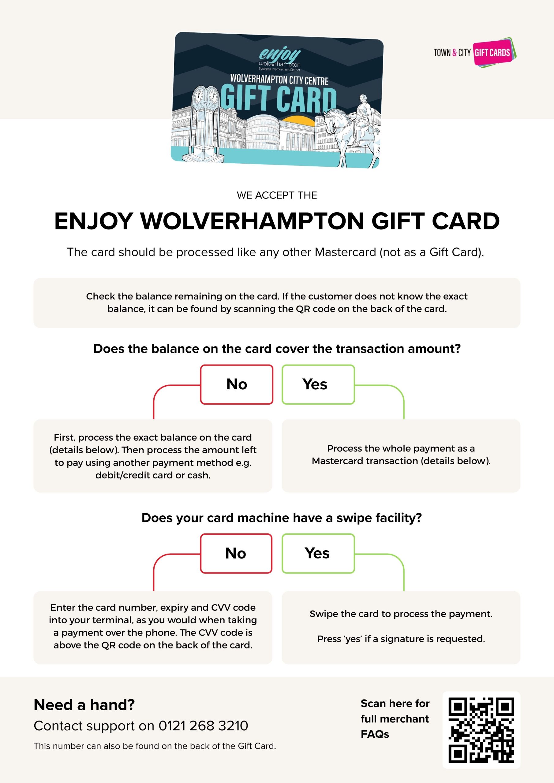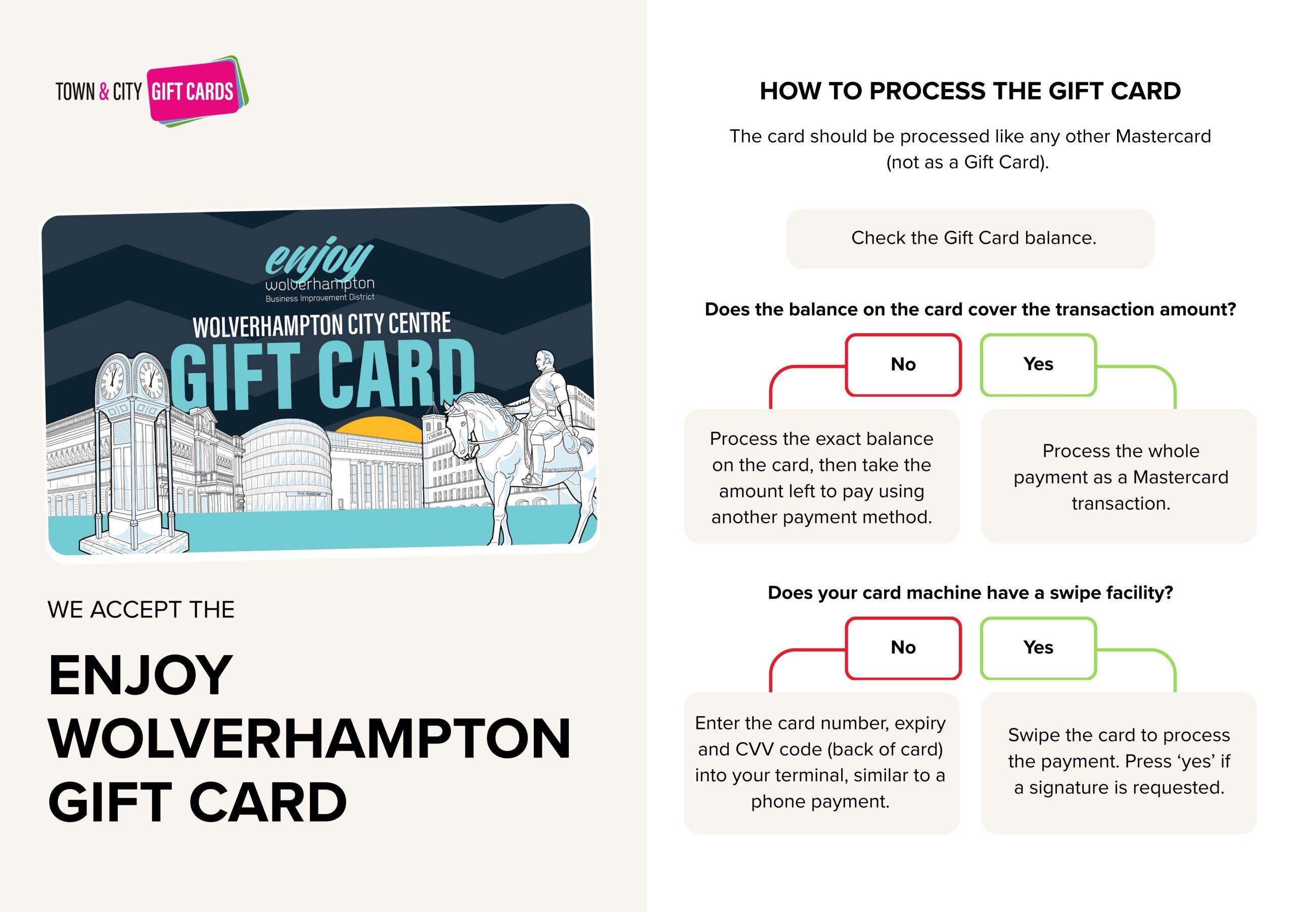 From reminding staff to process the card as a Mastercard to how to accept split payments, how to check the balance to the customer service number, place this cheat sheet at your till point and make accepting Town & City Gift Cards simple.